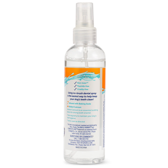 Arm & Hammer has nothing but the best for your pet. The Arm & Hammer Complete Care Dental Spray for Dogs makes caring for your dog's oral health easy. This dental spray for dogs is formulated with natural baking soda. It has a mint flavor to help freshen breath, eliminate tartar, and deter tooth decay. With no rinsing or brushing required, this dog dental spray is an easy way to keep your pet's teeth and breath fresh and clean.