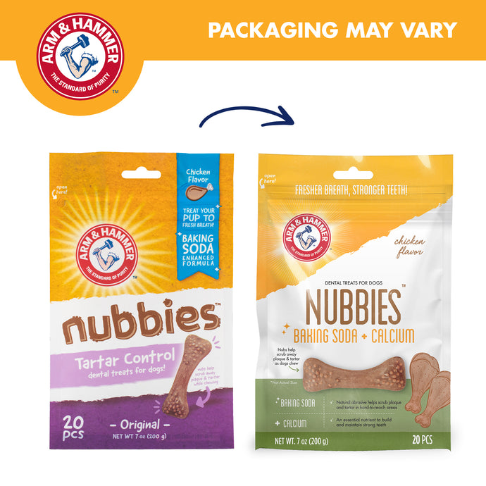 Arm & Hammer is the gold standard in dog dental care. Arm & Hammer Nubbies Tartar Control Dental Treats in Chicken flavor help maintain your precious pooch's important dental health by scrubbing away tartar and plaque from teeth, leaving behind fresh breath and a happy, well-treated dog. The treats taste great and are highly digestible. As your dog bites down, the semi-soft texture surrounds the tooth up to the gum line, helping remove tartar while chlorophyll helps freshen breath. Available in two sizes!