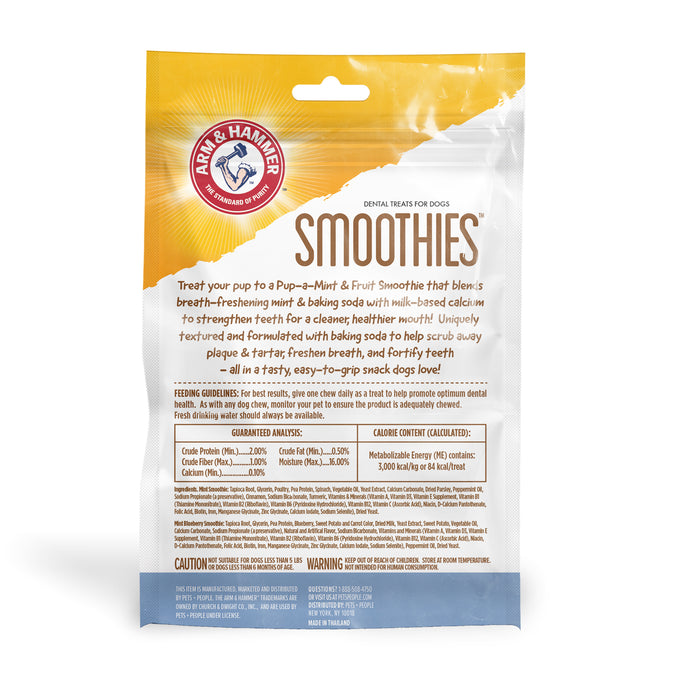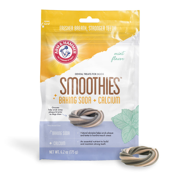 Treat your pup to a Pup-a-Mint Smoothie that blends breath-freshening mint and baking soda with milk-based calcium to strengthen teeth. Your pup will be on their way to fresher breath and stronger teeth with tasty snacks infused with Arm & Hammer™ Baking Soda plus calcium! These treats feature grooves that are uniquely shaped to help scrub away plaque and tartar as your dog chews. Plus, they’re specially formulated with baking soda to help freshen breath and help keep mouths clean as a natural abrasive. Our new formula also includes added calcium, an essential nutrient to build and maintain strong teeth. All this, wrapped up in a delicious, mint strawberry flavored, easy-to-grip snack that dogs love!