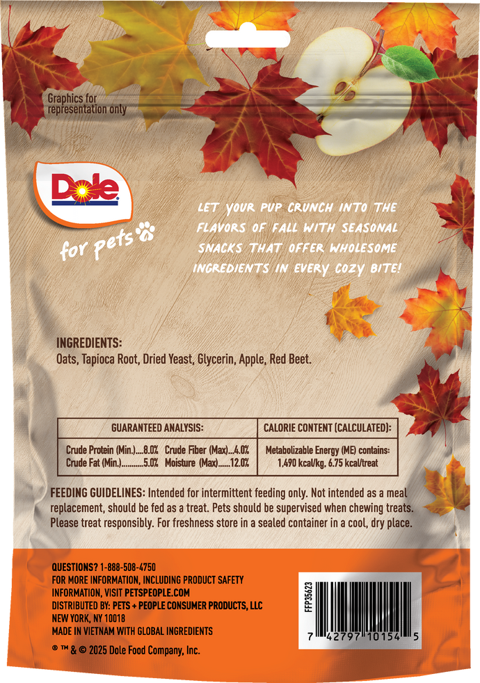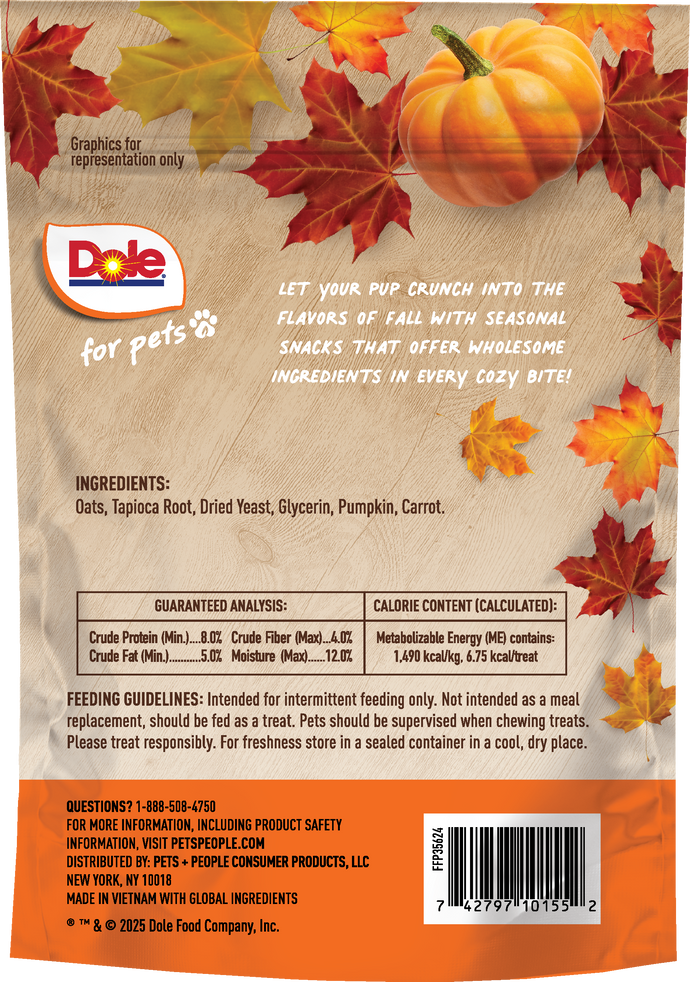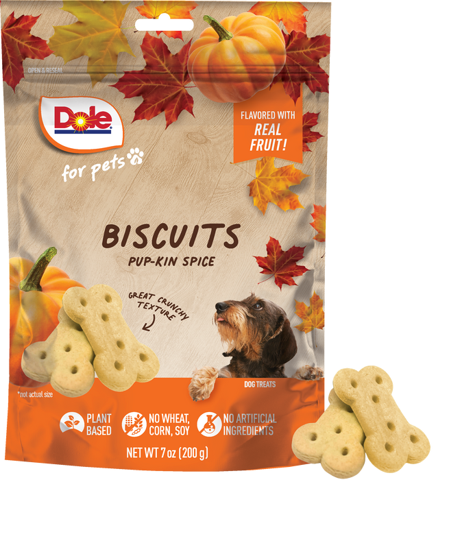 Let your pup crunch into the flavors of fall with seasonal snacks that offer wholesome ingredients in every cozy bite! For over 170 years, Dole® has delivered delicious, high-quality produce all around the world, and now Dole for Pets offers snacks that your pup will love, too! Dole for Pets Dog Biscuits are flavored with real fruits and veggies for a garden goodie treat and a taste that your pup will love! These tantalizing, tail wagging treats are packed with flavorful ingredients like air dried fruit powders. What’s more, Dole dog treats are vegan, plant-based treats that contain no wheat, corn, soy, artificial flavors, colors, preservatives, or animal products. Dole for Pets biscuits are paw-sitively wholesome treats packed with bright, flavorful air-dried fruit powders.