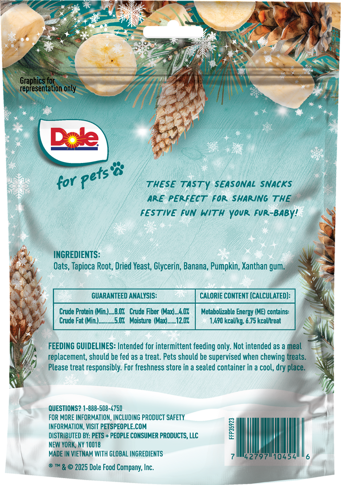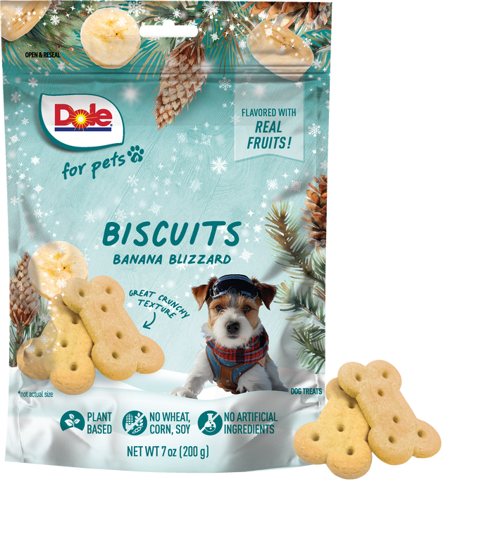 These tasty festive treats are perfect for sharing the festive fun with your fur-baby! For over 170 years, Dole has delivered delicious, high-quality produce all around the world, and now Dole for Pets offers snacks that your pup will love, too! Dole for Pets Dog Biscuits are flavored with real fruit for a Dole-icious treat and a taste that your pup will love! These tantalizing, tail wagging treats are packed with flavorful ingredients like air dried fruit powders. What's more, Dole dog treats are vegan, plant-based treats that contain no wheat, corn, soy, artificial flavors, colors, preservatives, or animal products. Dole for Pets biscuits are paw-sitively wholesome treats packed with bright, flavorful air-dried fruit powders.