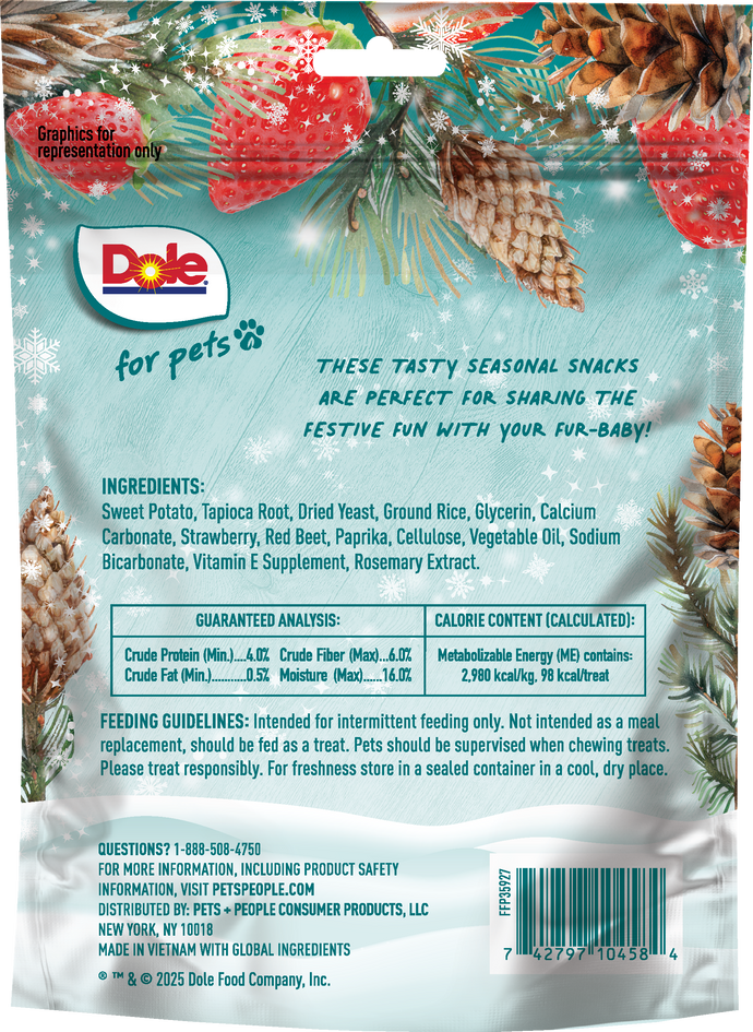 These tasty seasonal snacks are perfect for sharing the festive fun with your fur-baby! For over 170 years, Dole® has delivered delicious, high-quality produce all around the world, and now Dole for Pets offers snacks that your pup will love, too! Dole for Pets Dog Chews are flavored with real fruit for a Dole-icious treat and a taste that your pup will love! These tantalizing, tail wagging treats are packed with flavorful ingredients like air dried fruit powders. What’s more, Dole dog treats are vegan, plant-based treats that contain no wheat, corn, soy, artificial flavors, colors, preservatives, or animal products. Dole for Pets biscuits are paw-sitively wholesome treats packed with bright, flavorful air-dried fruit powders.